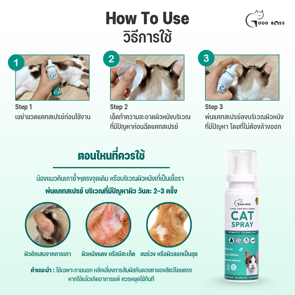- พ่นเเคทสเปรย์ลงบริเวณผิวหนังที่มีปัญหา โดยที่ไม่ต้องล้างออก