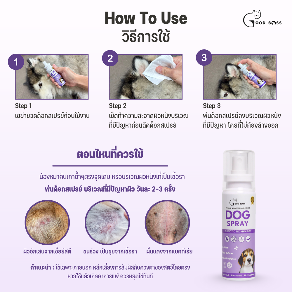 - พ่นด็อกสเปรย์ลงบริเวณผิวหนังที่มีปัญหา วันละ 2-3 ครั้ง โดยที่ไม่ต้องล้างออก