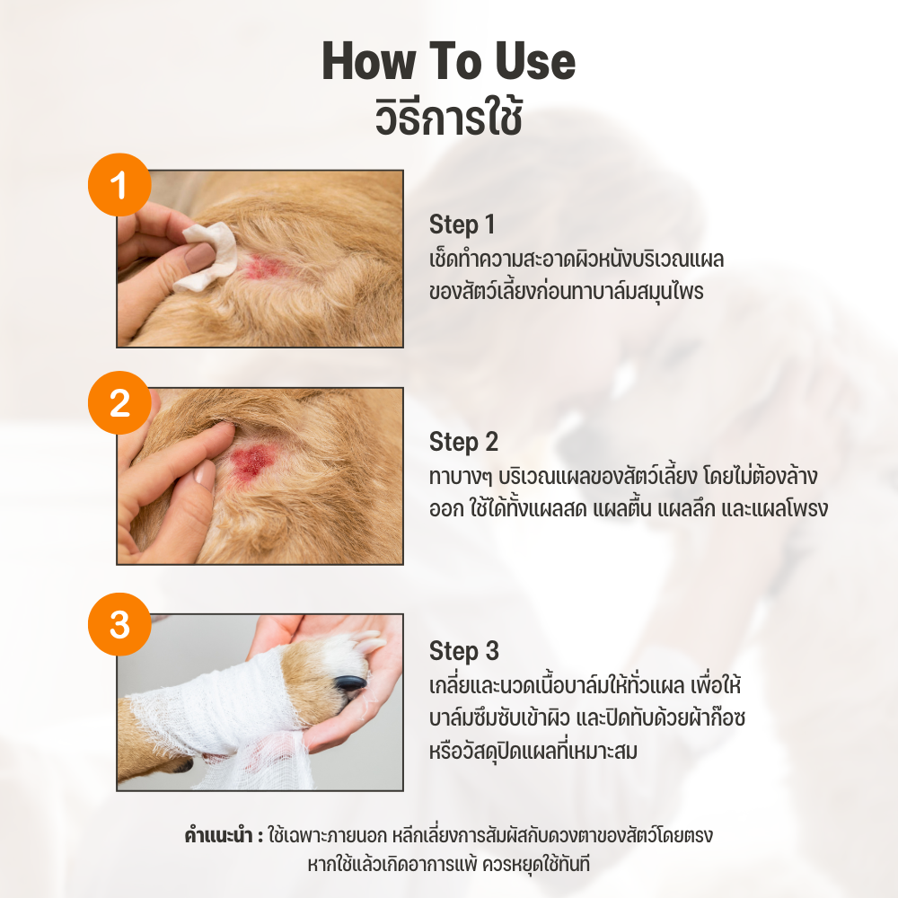- ทาบาล์มบางๆ วันละ 1 ครั้ง บริเวณผิวที่มีปัญหา เช่น เเผลสด เเผลอักเสบ เเผลรอยข่วน เเผลหลังผ่าตัด